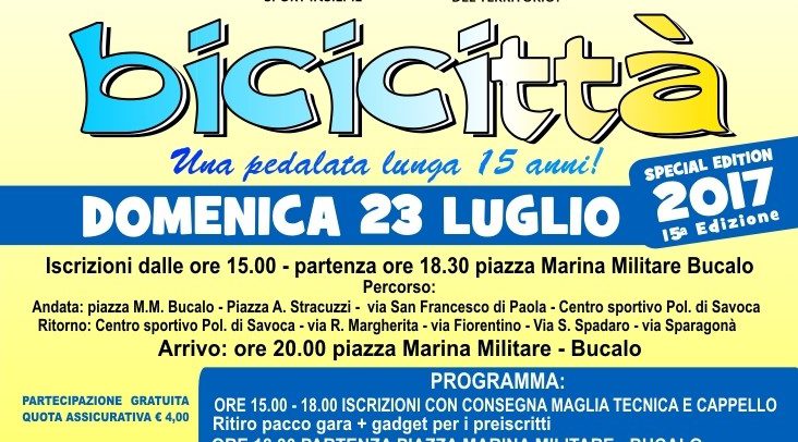 Domenica prossima arriva il classico appuntamento con Bicicitta’ organizzata dalla Polisportiva TC Junior di S.Teresa di Riva e da Radio Empire di Furci SIculo in collaborazione con i comuni di S.Teresa di Riva e di Savoca, giunta alla fatidica soglia delle 15 edizioni. La bicipasseggiata come da tradizione non competitiva e aperta agli amanti delle due ruote di tutte le eta’, partita’ da Piazza Marina Militare Bucalo alle ore 18.30.Le iscrizioni all’ evento saranno possibili dalle ore 15.00 , con consegna ad ogni partecipante di maglia tecnica e cappellino.