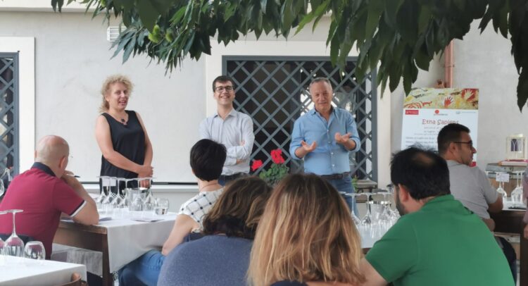 Ad accogliere e a dare il benvenuto al selezionato pubblico, non poteva mancare il saluto dei padroni di casa Tiziana Gandolfo e Camillo Privitera che, sotto l’ombra del Castagno e sotto lo sguardo del Vulcano hanno dato il via alla Serata , offrendo ai presenti un Calice del loro “PrimaeRosae”,rosato ottenuto da uve Nerello Mascalese che ben sintetizza l’idea di stile ed il carattere della realtà vitivinicola che rappresenta.