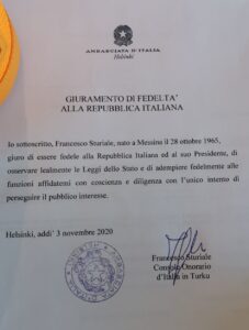 Giorno 3 Novembre 2020 nella rappresentanza diplomatica italiana in Finlandia, alla presenza dell’ambasciatore Sergio Pagano, si è svolta la cerimonia di giuramento del nuovo console onorario d’Italia a Turku, che così ha assunto formalmente servizio. Con questo adempimento, Francesco Sturiale ricopre un incarico rimasto vacante da lungo tempo.