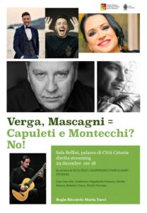 La storica controversia tra Giovanni Verga e Pietro Mascagni sarà al centro dell’evento “Verga, Mascagni = Capuleti e Montecchi? No!”, che andrà in scena domani sera, 29 dicembre, alle ore 18, in diretta streaming sui canali social (Yotube, Facebook, Instagram) dell’assessorato alla Cultura del Comune di Catania, nell’ambito della rassegna “Palcoscenico Catania. Il teatro e i grandi autori catanesi raccontano la Città”, realizzata dal Comune di Catania con il patrocinio della Regione Siciliana. La querelle tra i due grandi interpreti del verismo italiano, nel soggetto ideato da Guia Jelo e Gianfranco Pappalardo Fiumara con la regia di Riccardo Maria Tarci, saràparagonata alla rivalità tra Capuleti e Montecchi, le due nobili famiglie di Verona protagoniste della celebre opera di Shakespeare. In scena, dalla Sala Bellini del palazzo di Città di Catania, l’attrice Guia Jelo, che reciterà alcuni passi della novella ‘La Lupa, il maestro Gianfranco Pappalardo Fiumara, al pianoforte, Davide Sciacca, alla chitarra, ed il tenore Roberto Cresca. Lo spettacolo, felice connubio tra racconto e teatro, vedrà la fase narrativa affidata al dott. Nicolò Fiorenza, esperto di beni culturali, che ha valorizzato l’opera attraverso la ricostruzione dell’epoca storica in cui i due protagonisti hanno vissuto e attraverso le peculiarità artistiche e monumentali della città etnea.Tra le celebri arie che saranno eseguite: ‘Intermezzo sinfonico’, ‘Addio alla madre’ e ‘Siciliana’.