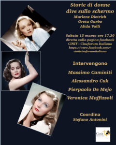 Si parlerà di tre grandi dive del cinema: Marlene Dietrich, Greta Garbo e Alida Valli. Interverranno, dopo i saluti di Massimo Caminiti, presidente del Cinit, Veronica Maffizzoli, direttrice del Garda Film Festival, giunto alla 14° edizione, Alessandro Cuk, autore del libro “Alida Valli – Da Pola ad Hollywood e oltre”, e Pierpaolo De Mejo, attore, regista e nipote di Alida Valli.