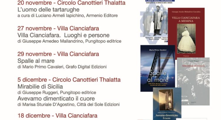 Come ogni anno, si apre l’Anteprima Libri di Cento Sicilie, il programma ricco di incontri e conversazioni attorno ai libri che raccontano pagine di storie, figure e temi legati alla nostra Isola. Del tema Isolitudine, che verrà sviluppato nell’edizione di CentoSicilie 2022 a maggio tra Messina e Roma, ci sarà un’Anteprima tutta messinese che si svolgerà dal 20 novembre fino al 20 dicembre. Sette libri e sette viaggi fra memorie, misteri avventure, fantasmagorie, scandiranno il ricco calendario di questo nuovo ciclo di appuntamenti curato da Milena Romeo. Si parte il 20 novembre al Circolo Canottieri Thalatta con L’uomo delle tartarughe, a cura di Luciano Armeli Iapichino; si prosegue il 27 novembre con Villa Cianciafara a Messina di Giuseppe Amedeo Mallandrino Cianciafara e il 29 novembre con un dibattito attorno al libro Spalle al mare di Mario Primo Cavaleri; il 5 dicembre Mirabilie di Sicilia di Giuseppe Ruggeri e Avevamo dimenticato il cuore di Marisa Sturiale D’Agostino; il 18 dicembre L’assassinio di Giuseppe Fulci. Dagli intrighi dinastici della Marcia su Roma al chinino letale “di Stato” di Marcello Saija; per concludere il 19 dicembre con Bonjour Casimiro. Il Barone e la Villa Fatata, il nuovo libro di Alberto Samonà . Tra i numerosi ospiti attesi agli eventi interverranno: Nello Musumeci( Presidente Regione Siciliana) Alberto Samonà ( Assessore ai Beni Culturali Regione Siciliana) Gaetano Silvestri( Già Presedente Emerito Corte Costituzionale) Fabio Rugge ( Storico e già Rettore dell’Università di Pavia) Maria Teresa Arena( Consigliere della Corte d’Appello di Messina) Giuseppe Astuto( Ordinario Storia Istituzioni Politiche UniCt) Daniela Novarese ( Ordinario Storia Istituzioni Politiche) UniMe) Giorgio Schichilone( Ordinario Storia Istituzioni Politiche UniPa) Davide Faraone( Senatore Italia Viva), Antonio Baglio ( Dicam- Università degli Studi di Messina) Filippo Grasso ( Dip. Economia- Università degli Studi di Messina) Mirella Vinci ( Soprintendente BB.CC. Messina) Pio Cerocchi ( giornalista) Diego Ronsisvalle( regista) Mirella Bolognari( docente). Le letture saranno intrepretate da Luca Fiorino, Gianni Di Giacomo e Sabrina Sabbà. Gli incontri saranno coordinati da Milena Romeo, inizieranno tutti alle ore 17,30 con accesso libero e obbligo di Green Pass. La rassegna è promossa dall’associazione Cara beltà in collaborazione con Villa Cianciafara e il Circolo Canottieri Thalatta che saranno anche le due sedi degli eventi, insieme all’associazione Antonello da Messina, L’AMMI e la Fondazione Lucio Piccolo di Calanovella .