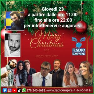 👉Domani 23 Dicembre dalle ore 11:00 alle 22,00 ci sarà la Maratona Empire Special Merry Christmas con tutti i programmi della settimana incentrati in un unico giorno per poter augurare un Buon Natale a tutti voi radioascoltatori.