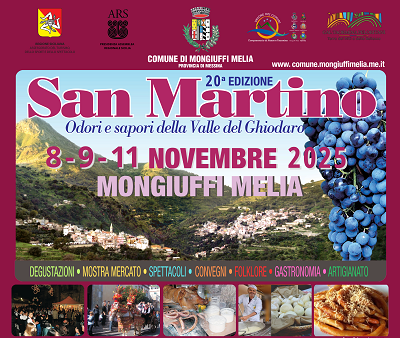 Reso noto il programma della 20^ edizione della mostra mercato e degustazione di prodotti tipici siciliani denominata “San Martino” odori e sapori della Valle del Ghiodaro che si terrà nel Comune di Mongiuffi Melia dal 8, 9 e 11 novembre prossimo. Quest’anno la kermesse – come spiega il Sindaco Rosario D’Amore si articolerà in 3 giorni. Si inizia sabato 8 novembre alle ore 11.00 presso i locali di Palazzo Corvaja con l’Inaugurazione della Mostra d’ arte contemporanea ” Cielo e Terra” di Mattia Vincenzo Congiu. Alle ore 11:30 ci sarà l’ apertura dei 30 stands espositivi di prodotti tipici e artigianato con inizio delle degustazioni. Nel pomeriggio si continua con le visite guidate, la sfilata di carretti siciliani e lo showcooking a cura della Trattoria Valle del Ghiodaro.
