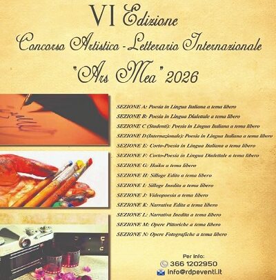 L’Associazione Culturale “RDP Eventi” comunica l’apertura della VI Edizione del Concorso Artistico-Letterario Internazionale “Ars Mea” 2026, con scadenza al 31 Maggio 2026.